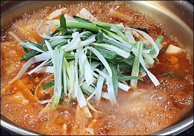 6. 마무리 : 거품 걷고, 대파와 청양고추를 마지막에 넣고 한소끔 더 끓이기!